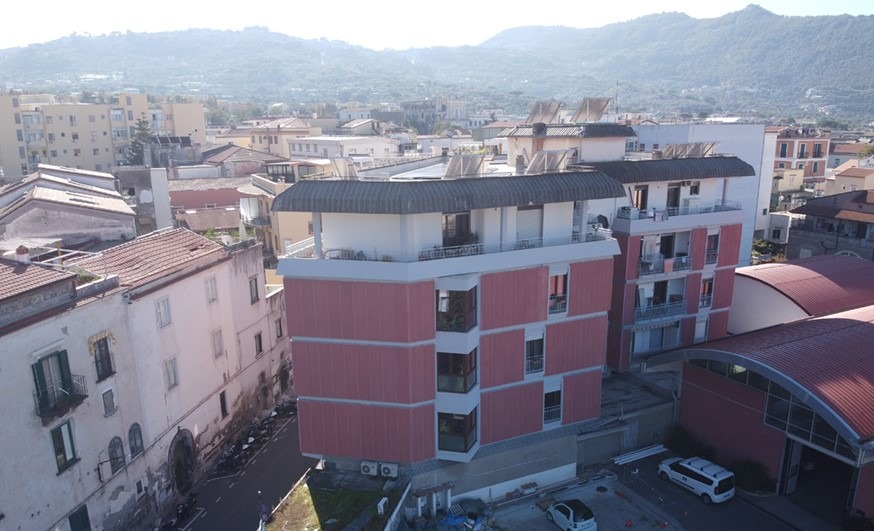 Il fabbricato, costruito negli anni ‘60 con la tecnologia brevettata del pannello in c.a. colorato, aveva necessità di riprisitino del calcestruzzo. Utilizzando il Superbonus, è in corso un migliormanto energetico e tecnologico delle facciate. Sono stati quindi rimossi i pannelli esistenti e ricreati gli stessi con una diversa tecnologia: un telaio in alluminio al cui interno è stato inserito un pannello di acquapanel rivestito con graniglia colorata. All’interno del nuovo telaio si è inserito un pannello coibentato.