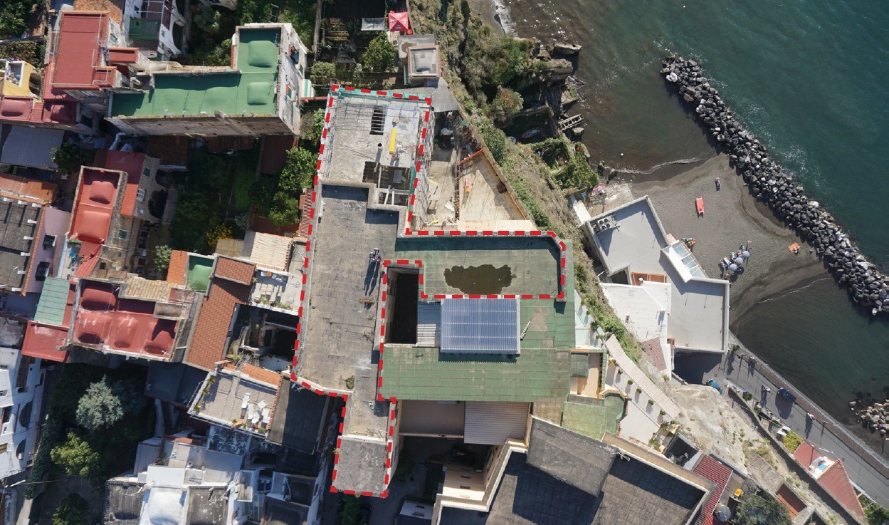 Il fabbricato è composto da un piano terra e tre piani fuori terra, oltre che ad una terrazza in copertura accessibile da uno dei due blocchi scala presenti. L’edificio si sviluppa in maniera longitudinale verso il suo affaccio a Nord direttamente sul mare. I lavori hanno riguaradato una ristrutturazione pesante a partire dal restauro del c.a. che si trovava in pessime condizioni a causa dell’abbandono e della vicinanza con il mare.